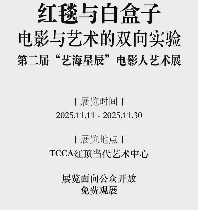 第二屆“藝海星辰”電影人藝術(shù)展《紅毯與白盒子:電影與藝術(shù)的雙向?qū)嶒灐氛褂[現(xiàn)場 第二屆“藝海星辰”電影人藝術(shù)展《紅毯與白盒子——電影與藝術(shù)的雙向?qū)嶒灐纷?1月11日起在TCCA紅頂當(dāng)代藝術(shù)中心持續(xù)展出至11月30日。展期內(nèi),觀眾可前往廈門市湖里區(qū),在這座兼具工業(yè)記憶與當(dāng)代氣質(zhì)的藝術(shù)空間中,沉浸式感受電影與藝術(shù)交融的獨特魅力,在一件件作品、一段段影像之間,開啟一段屬于自己的“紅毯”與“白盒子”的旅程。 關(guān)于展覽